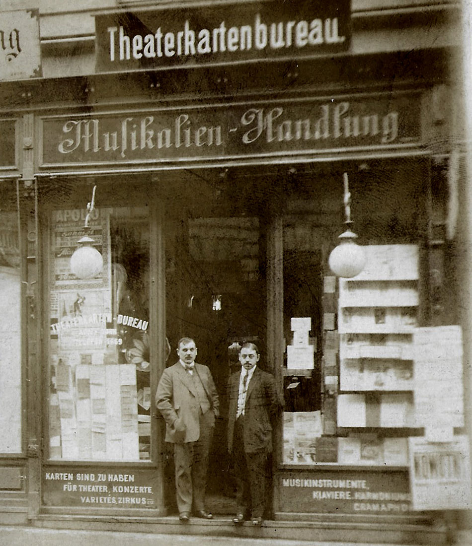 Die Firma „Friederike Mayer“ Musikalienverlag, -sortiment, Antiquariat und Leihbibliothek, anfang des 20. Jahrhunderts.