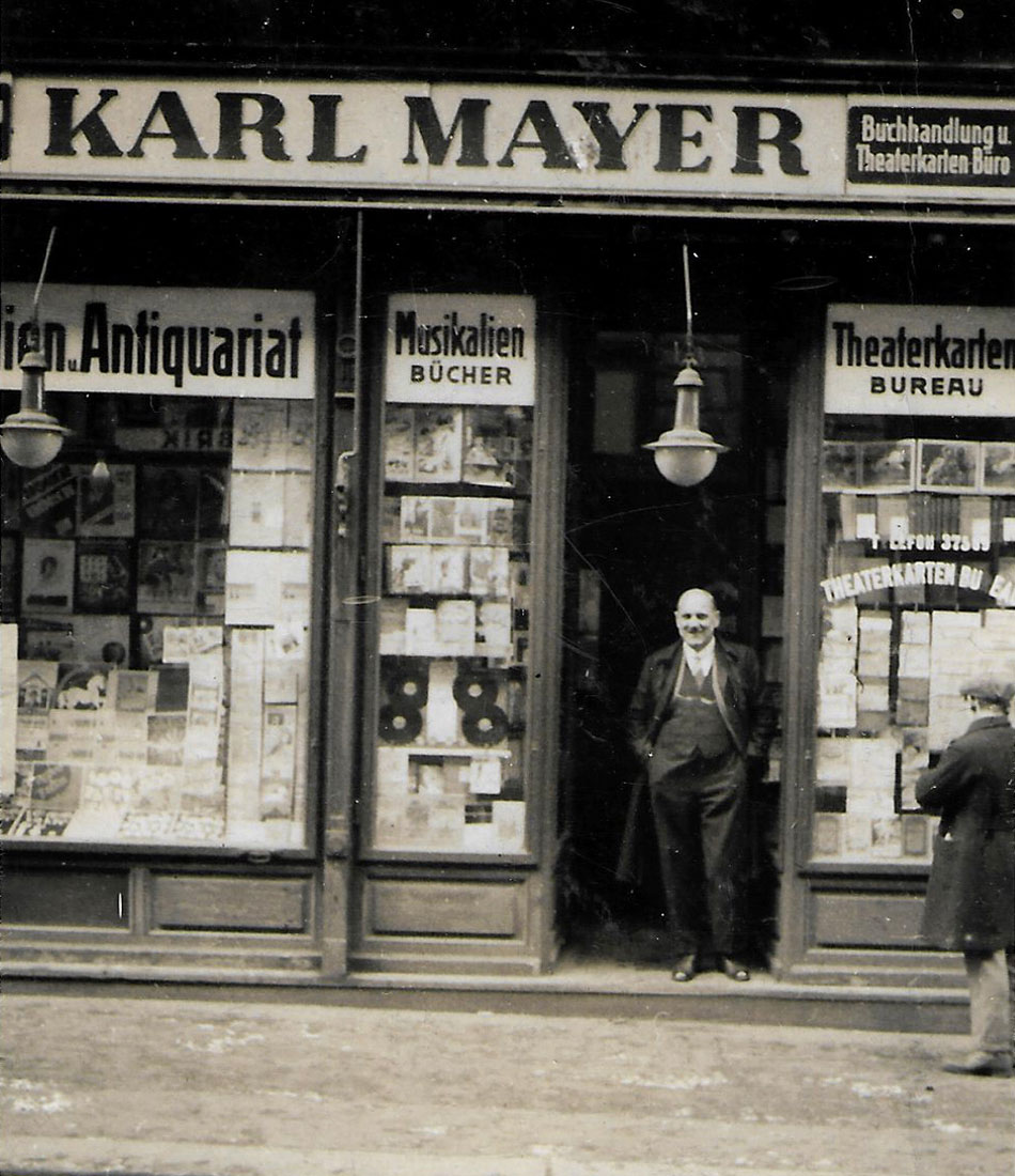 Karl Mayer vor seiner Buchhandlung in der Burggasse, Wien.