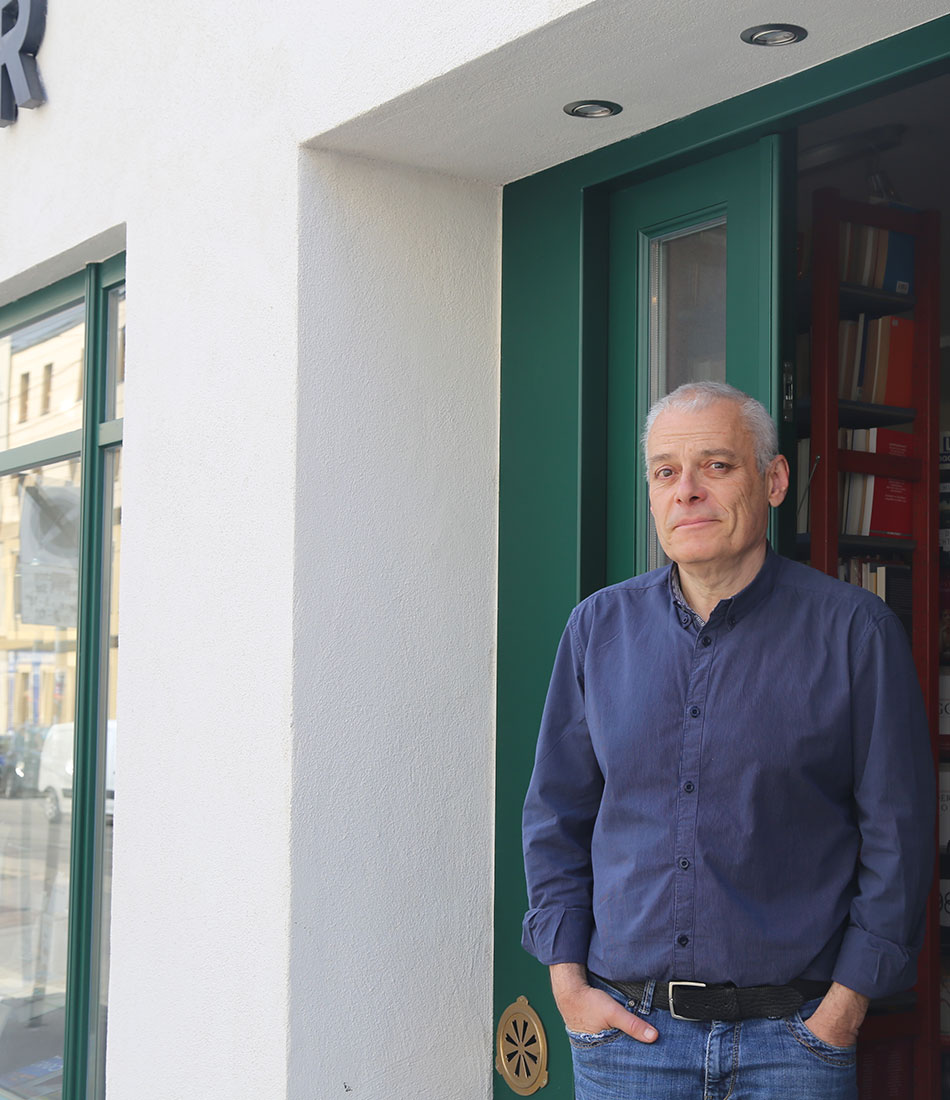 Massimo Margaritella vor seiner Buchhandlung in der Ottakringerstrasse, Wien (2022).